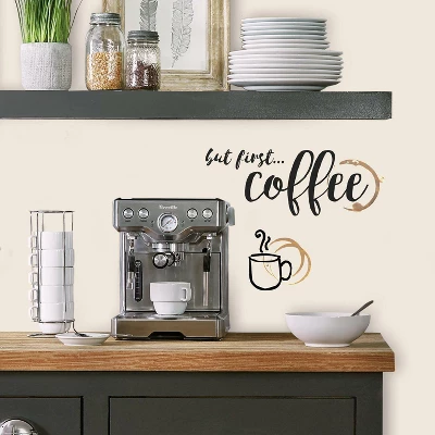 Enhance a space with But First Coffee Quote Peel and Stick Wall Decals. Simply peel and stick to any smooth, flat surface for instant results. Remove, reposition and reuse as often as needed. No sticky residue is left behind. Walls stay clean every time. ?Add personality to your walls today with RoomMates Wall Decals!