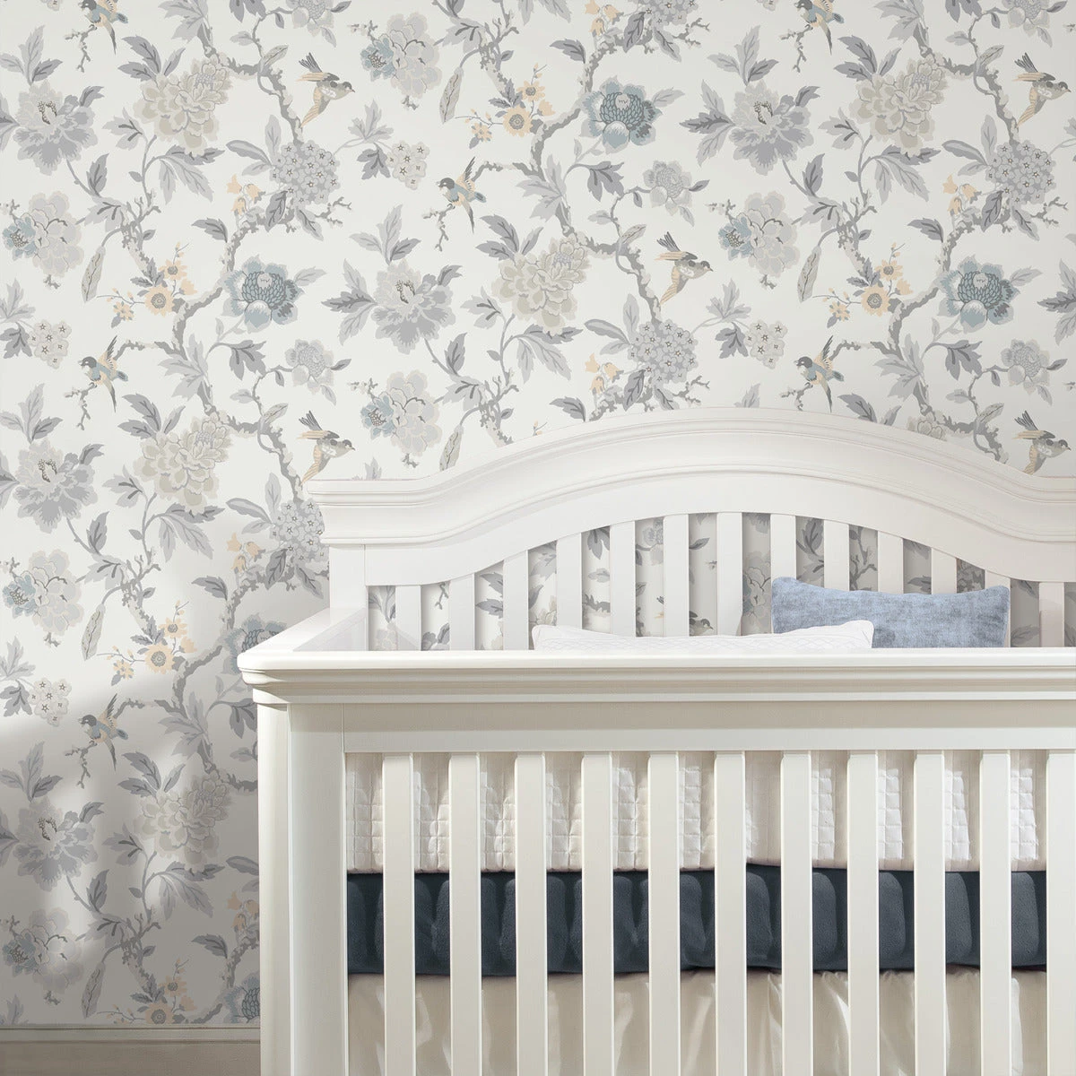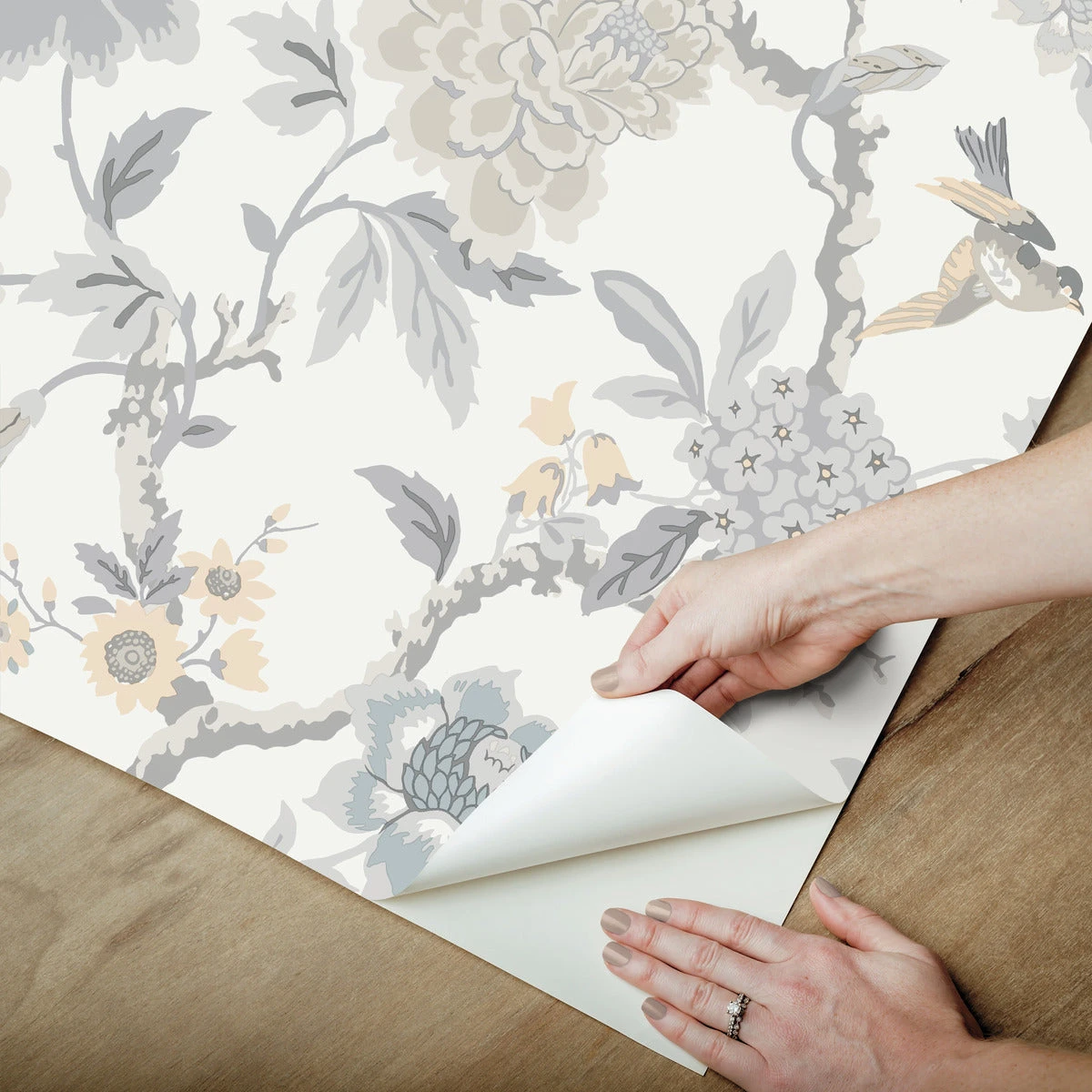 Curious chinoiserie charm will flitter into your space with this gorgeous trailing floral peel and stick wallpaper. Subdued tones of greys and blues make for a graceful look in as little as peel, stick & done!