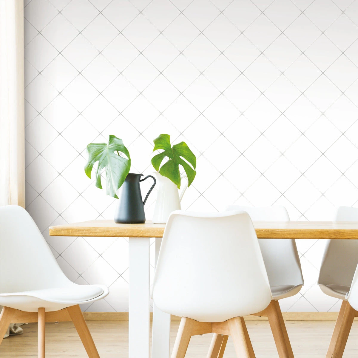 This classic square grid design is given a new look with Diamond Tile peel and stick wallpaper from RoomMates by angling it into a vertical diamond shape. The fine gray lines become deeper at the tile joints and rest on top of a clean white background making this timeless color combination the perfect wallpaper for either a washed white reclaimed decor or a slick, sophisticated gray and white statement. Peel and stick wallpaper can be used on any flat surface, and this design lends itself to bookcases and other accent furniture as well.