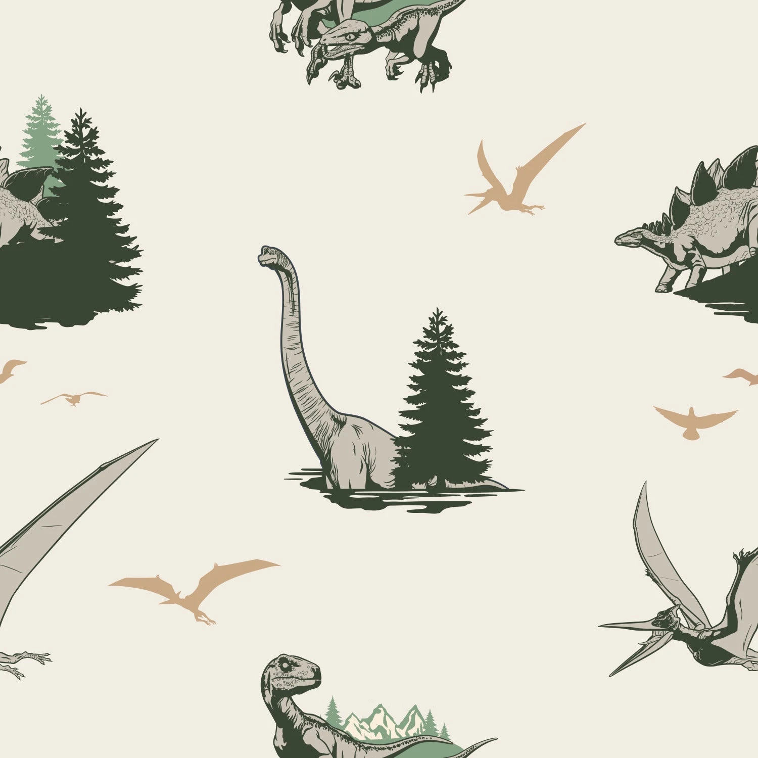 raptors, diplodocuses, and stegosauruses abound with a vintage flair that gives this fun