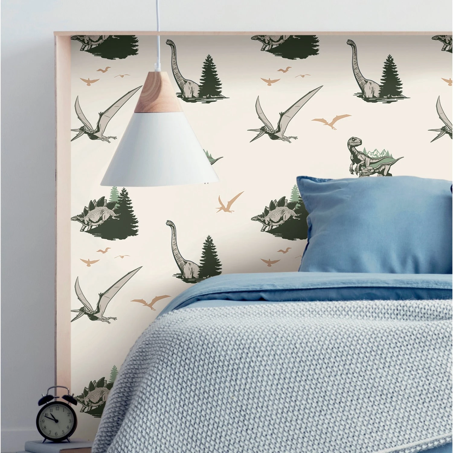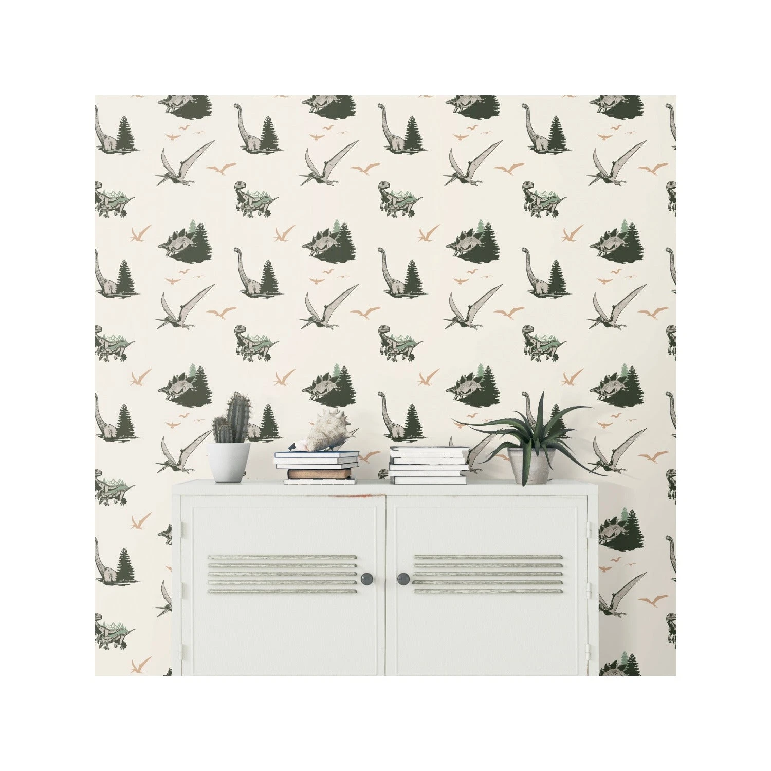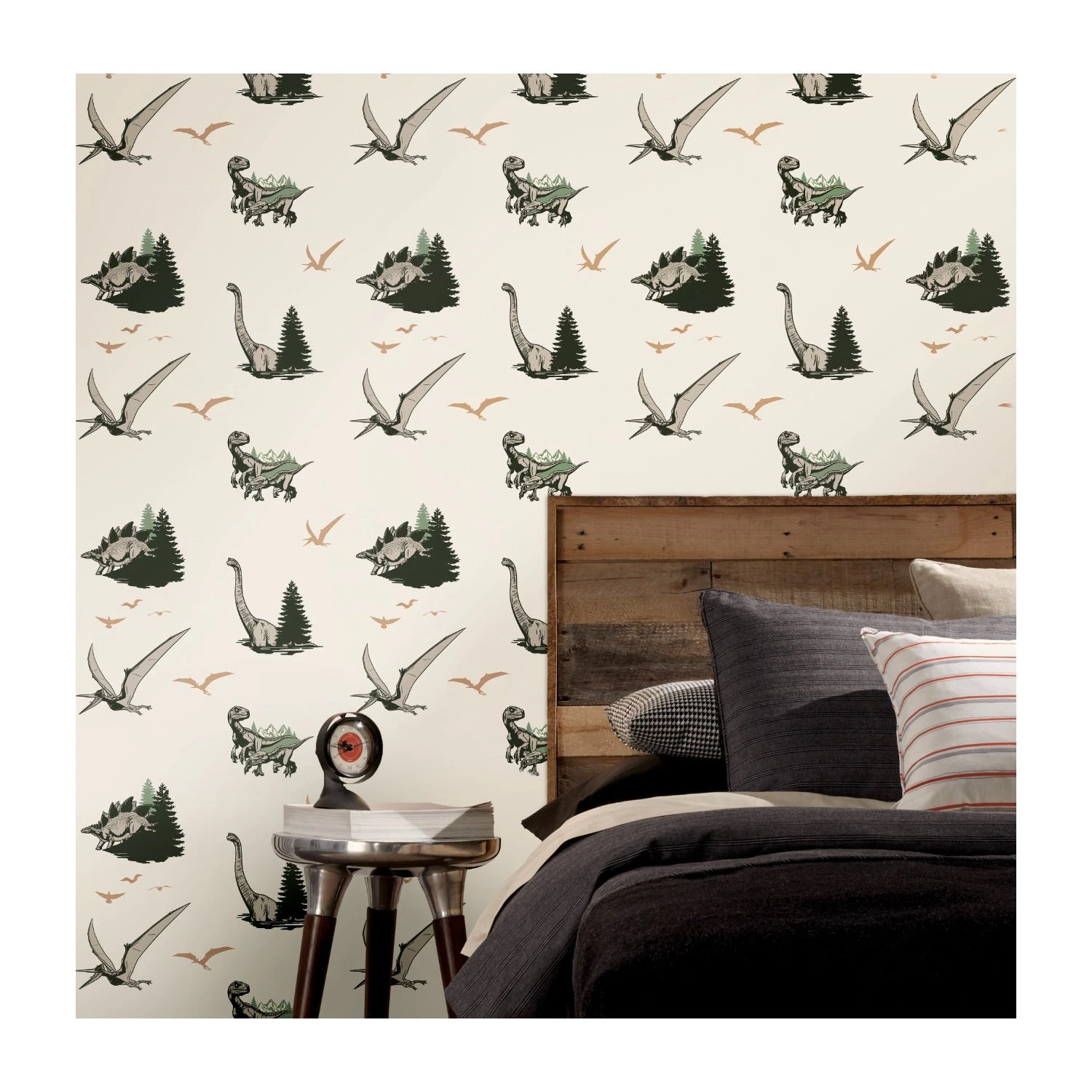 Jurassic World awesomeness meets vintage wallpaper in this retro-looking peel and stick