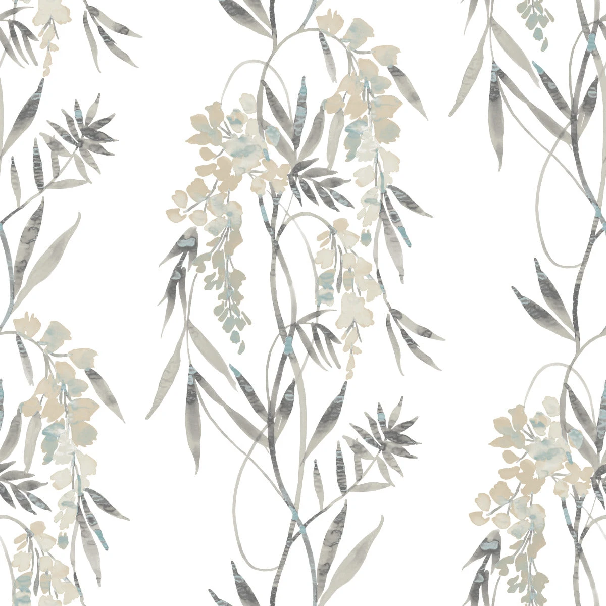Bring graceful style to your home with this Nouveaux Wisteria Peel and Stick Wallpaper from RoomMates. Create an atmosphere full of calm and soothing energy in any room with these delicate flowering vines in neutrals on a soothing white ground.