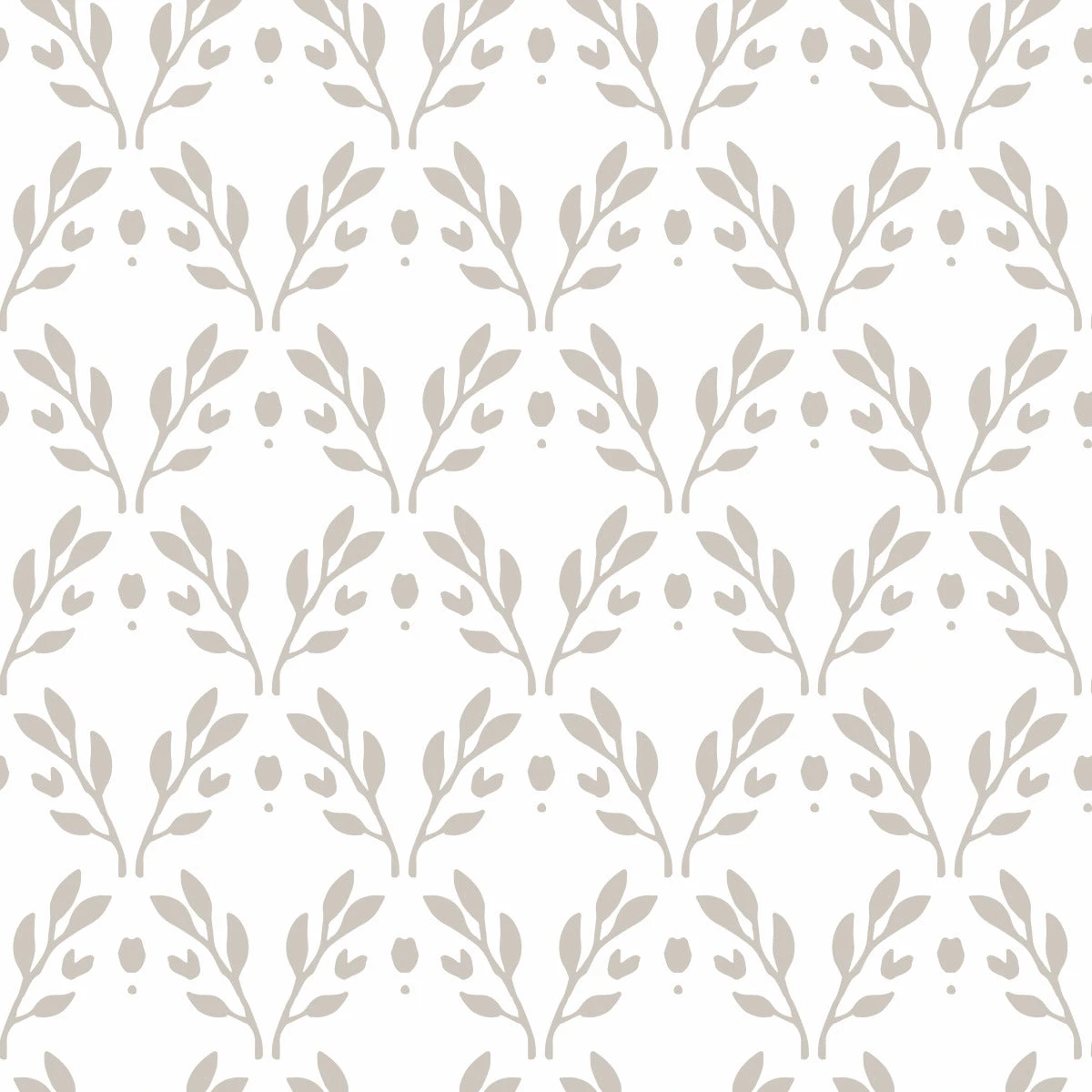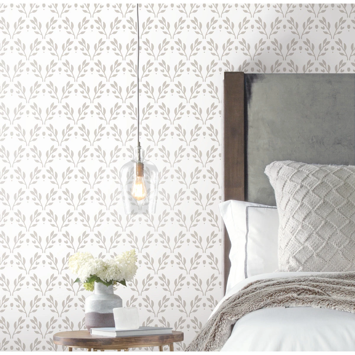 Graceful leafy stems in diamond shaped trellis create simple yet sophisticated wall decor with Dawn peel and stick wallpaper by Rose Lindo for RoomMates.