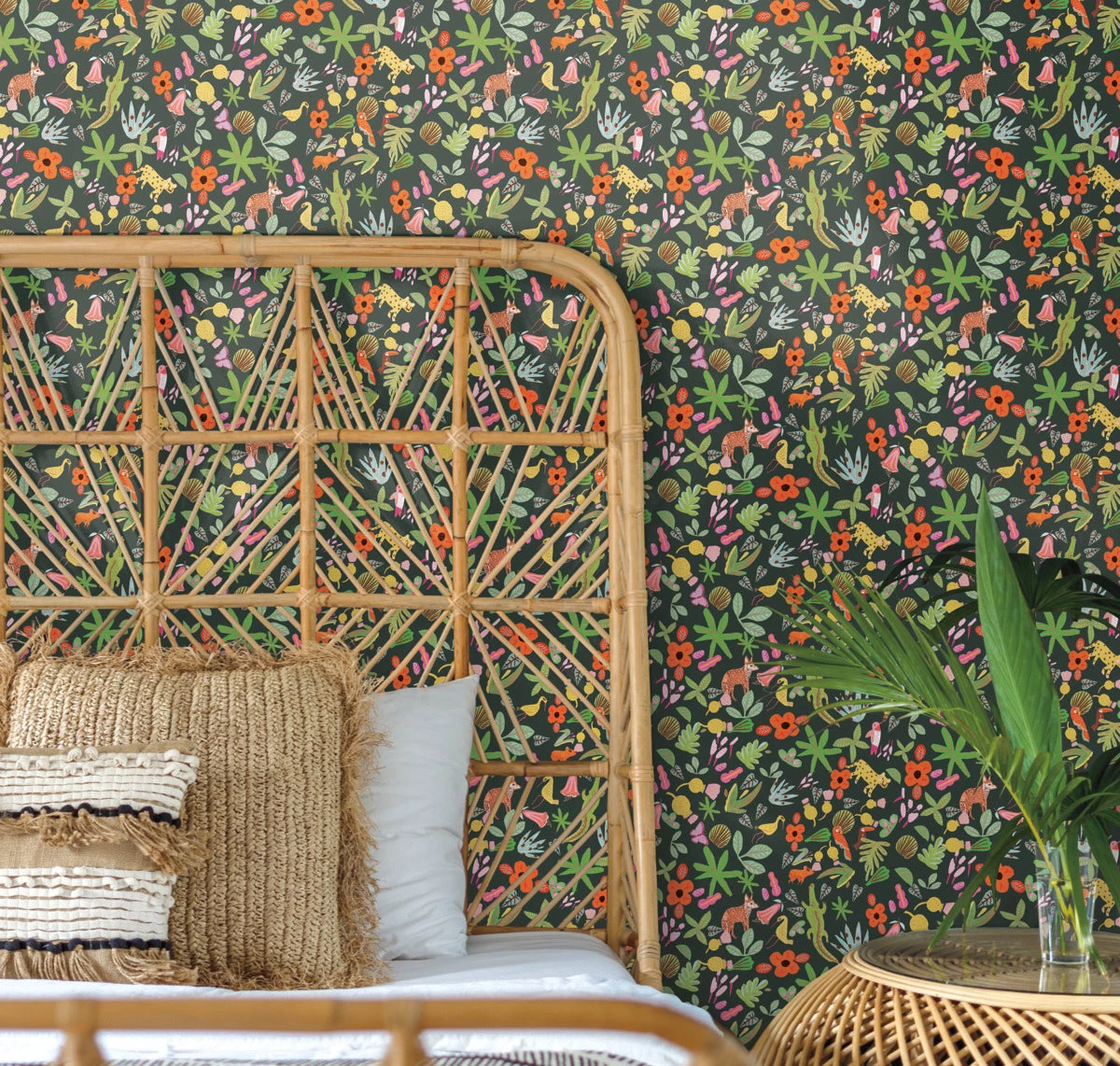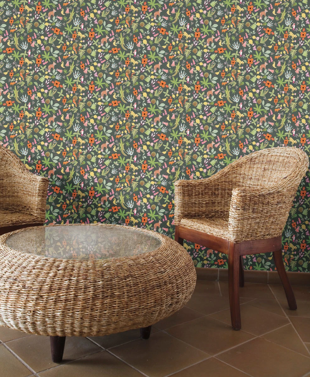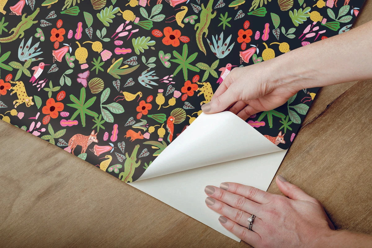 Step into the wild with a lush and friendly forest of vibrant colored jungle animals in this Selva Peel and Stick Wallpaper from RoomMates created by Priscilla Aguirre, the designer behind HolaLola.