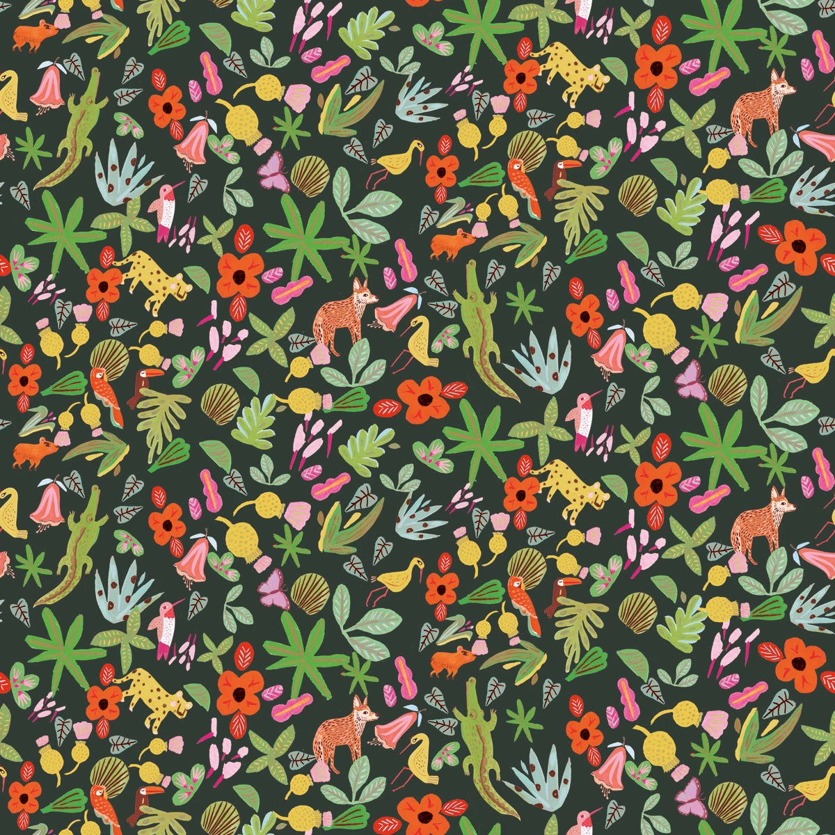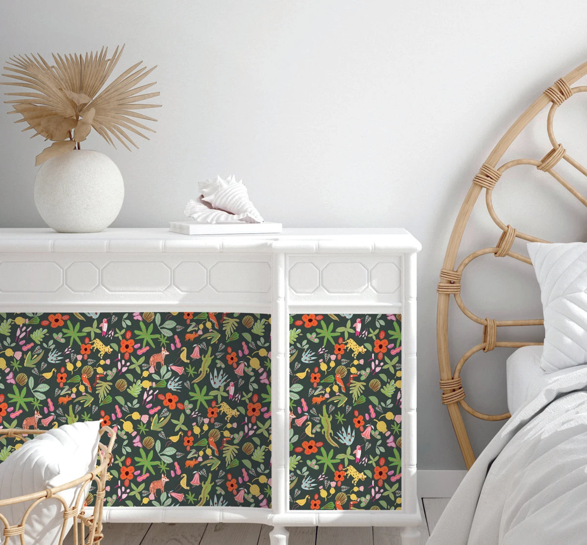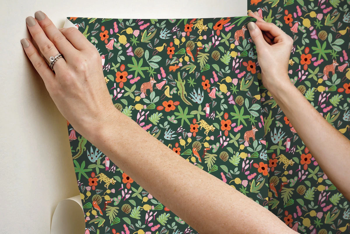 Step into the wild with a lush and friendly forest of vibrant colored jungle animals in this Selva Peel and Stick Wallpaper from RoomMates created by Priscilla Aguirre, the designer behind HolaLola.