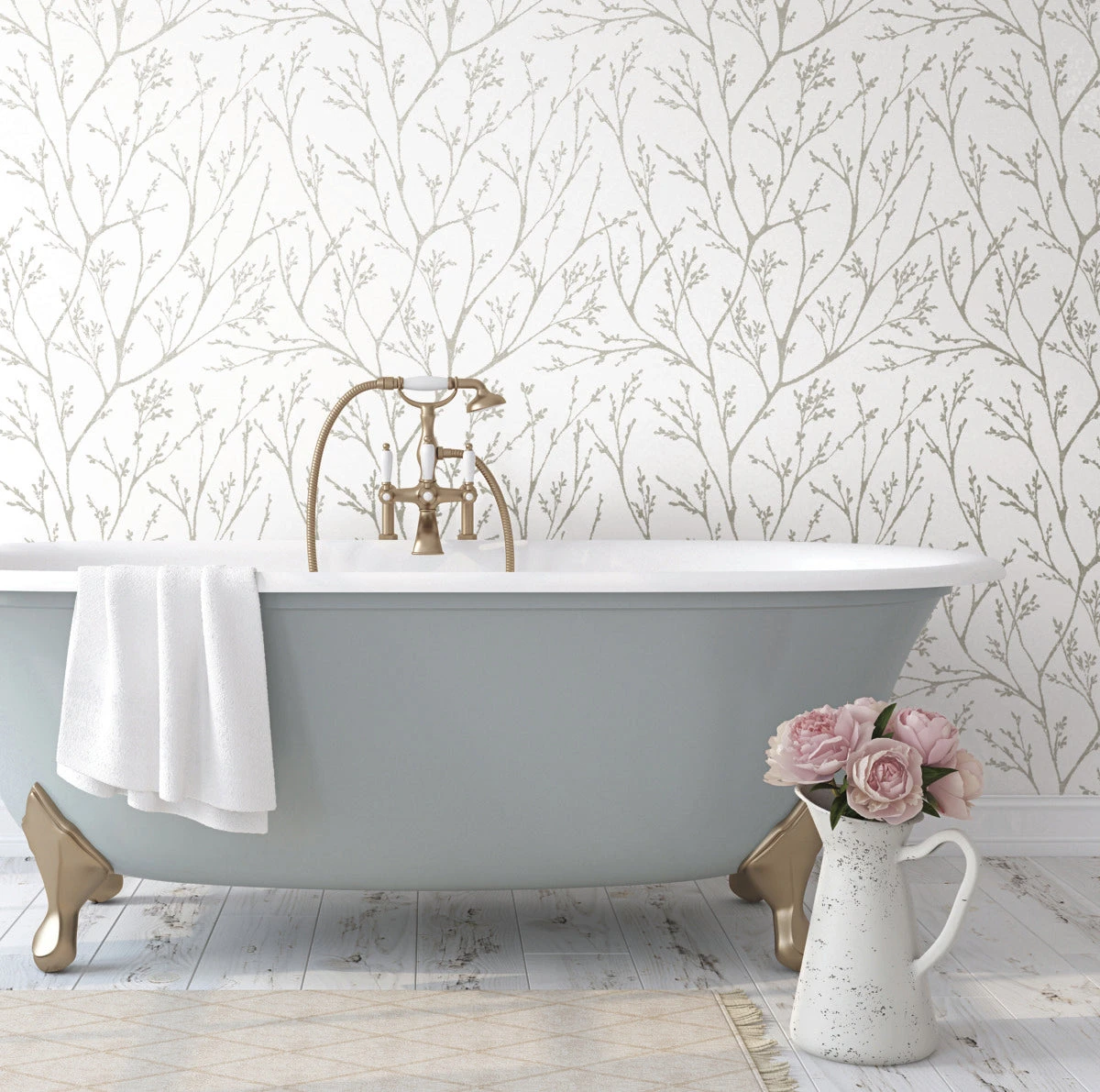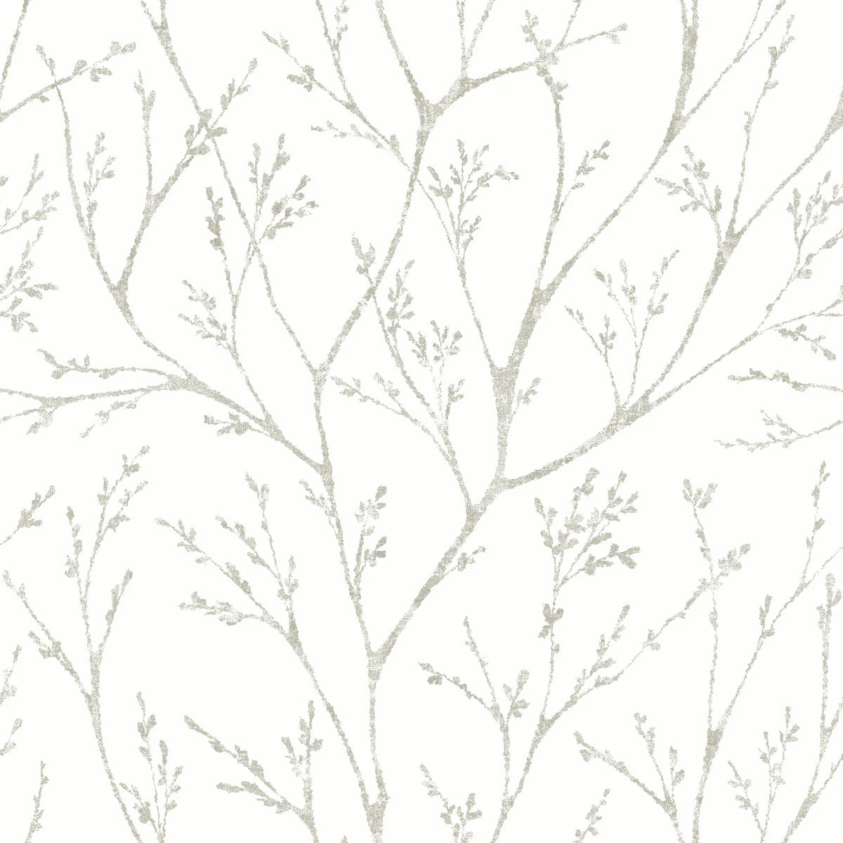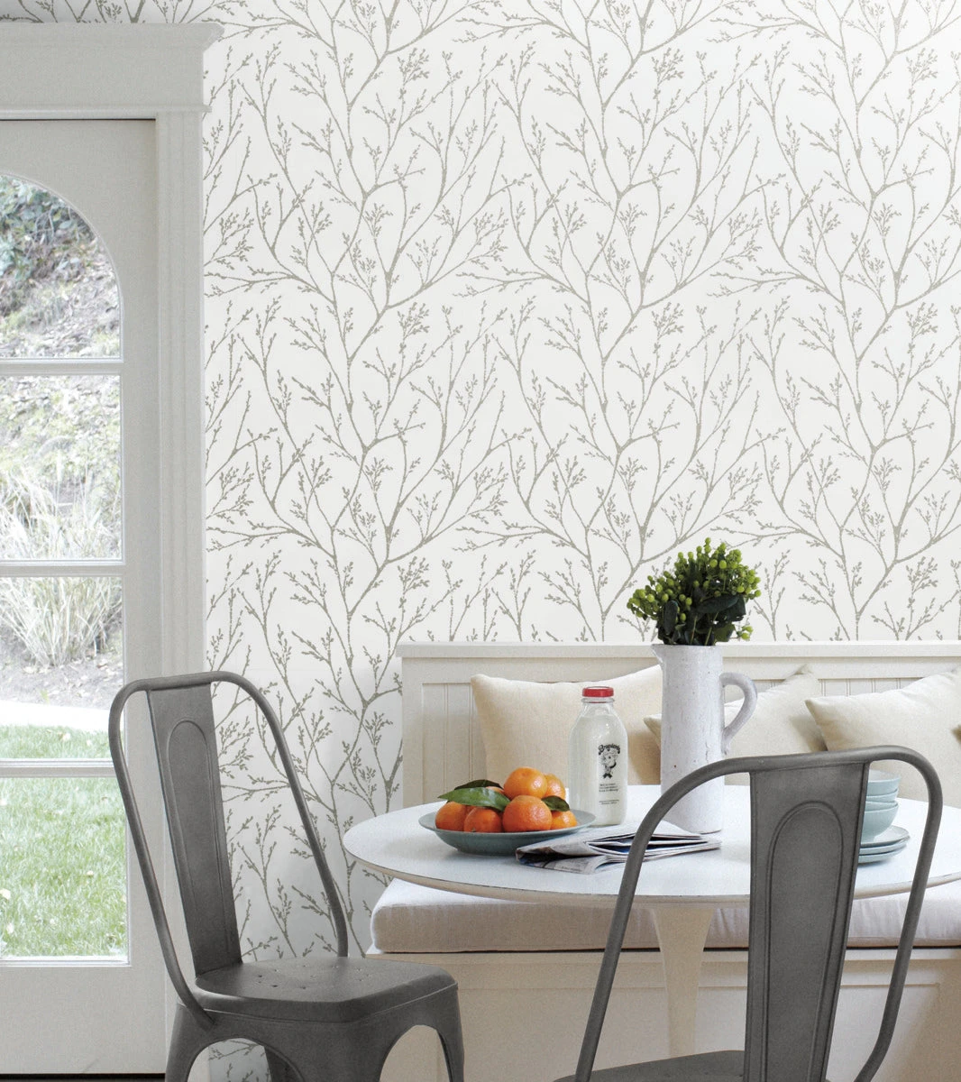 These stamp inked style gently swaying tree branches, tipped with first bloom leaves, stand in restful silhouette against a clean background in this Tree Branches peel and stick wallpaper from RoomMates.