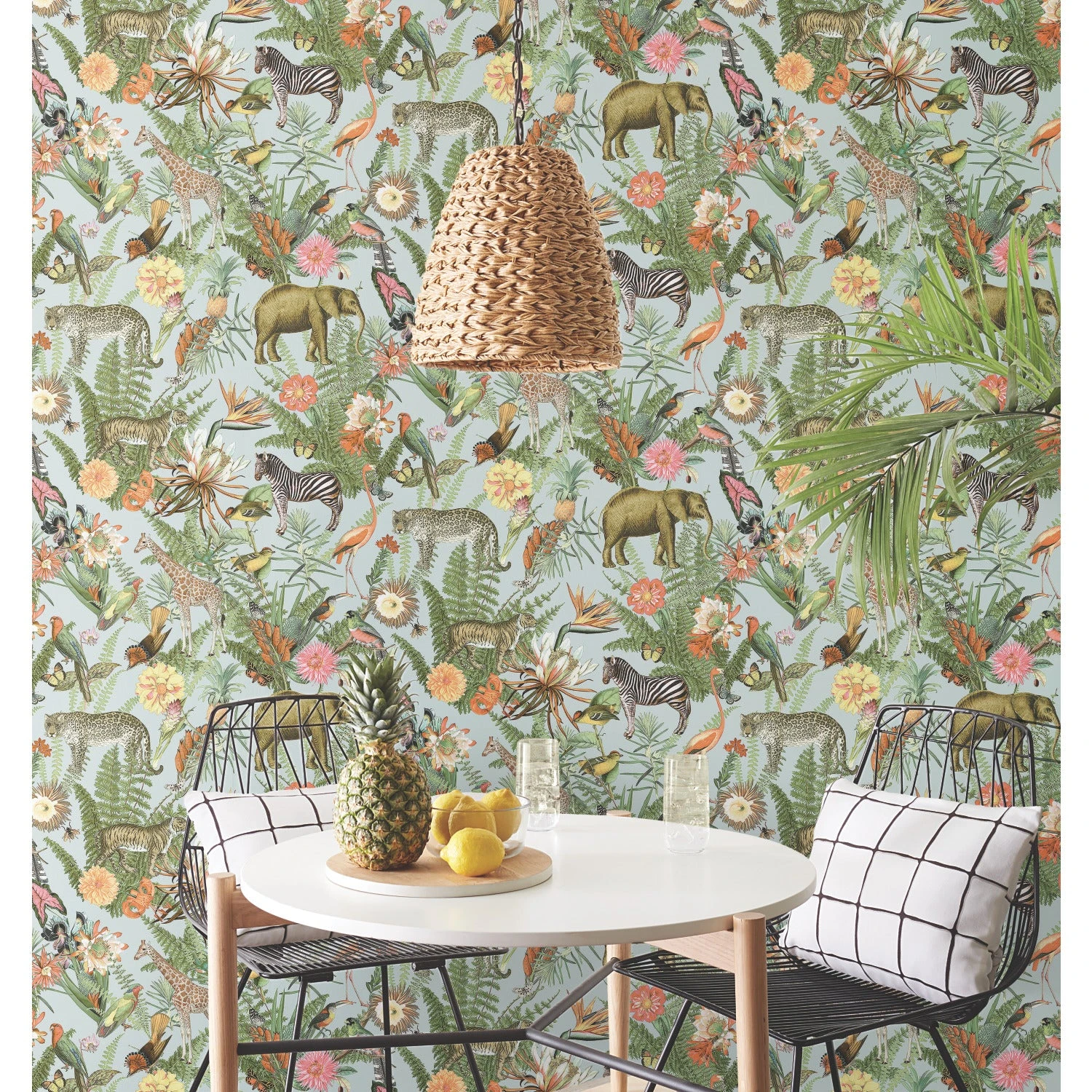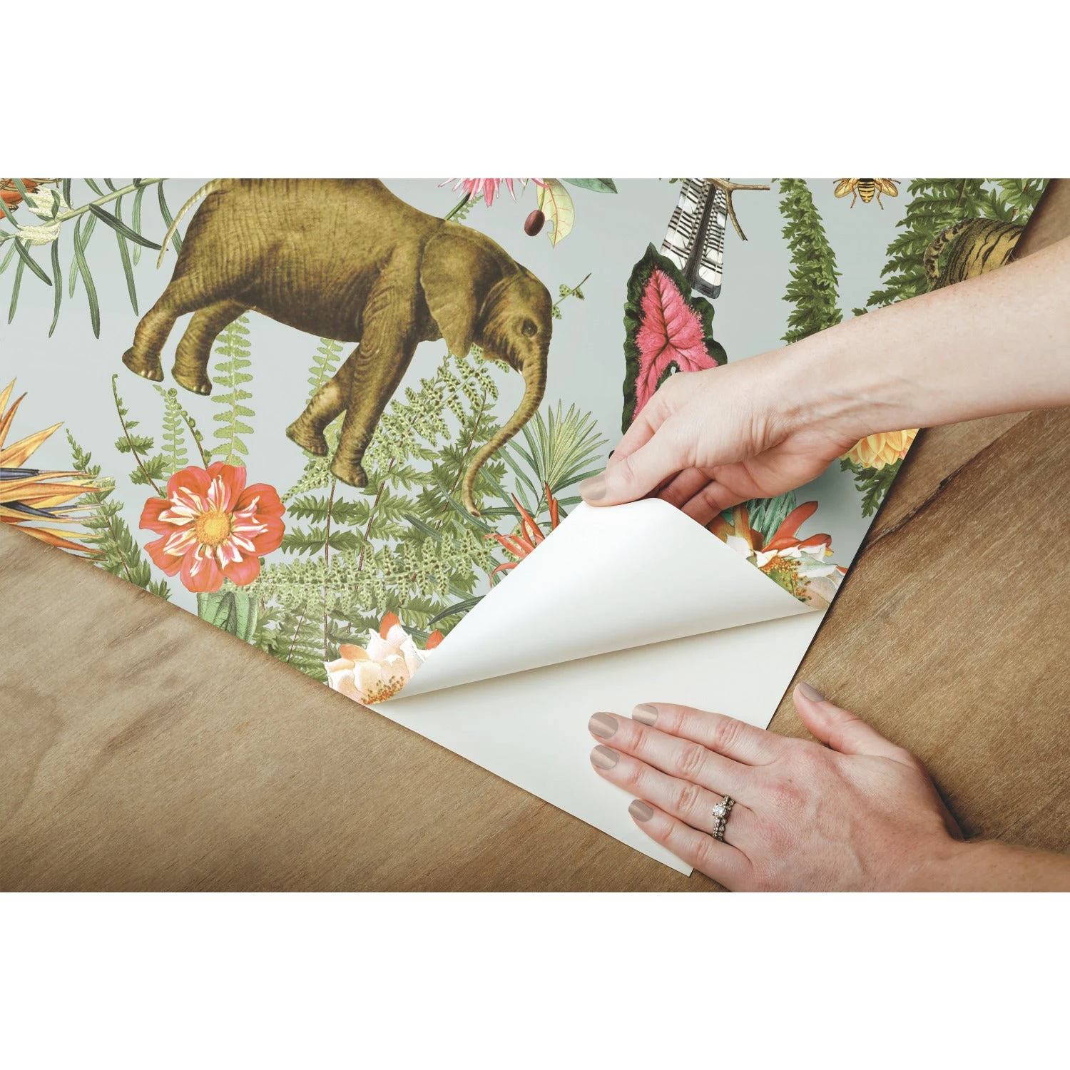A lush oasis of tropical plants and flowers surround the exotic animals of the Serengeti in this Tropical Zoo peel and stick wallpaper from RoomMates.