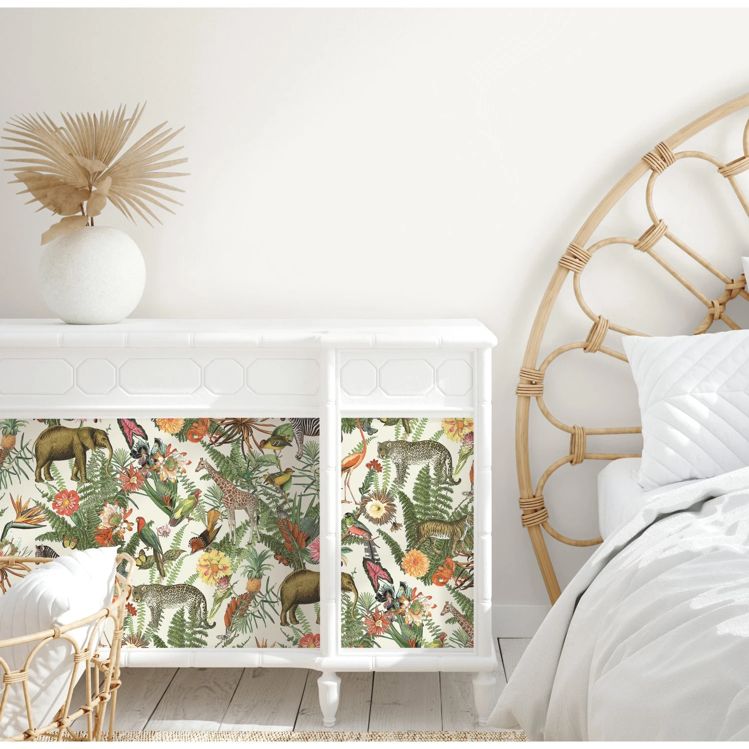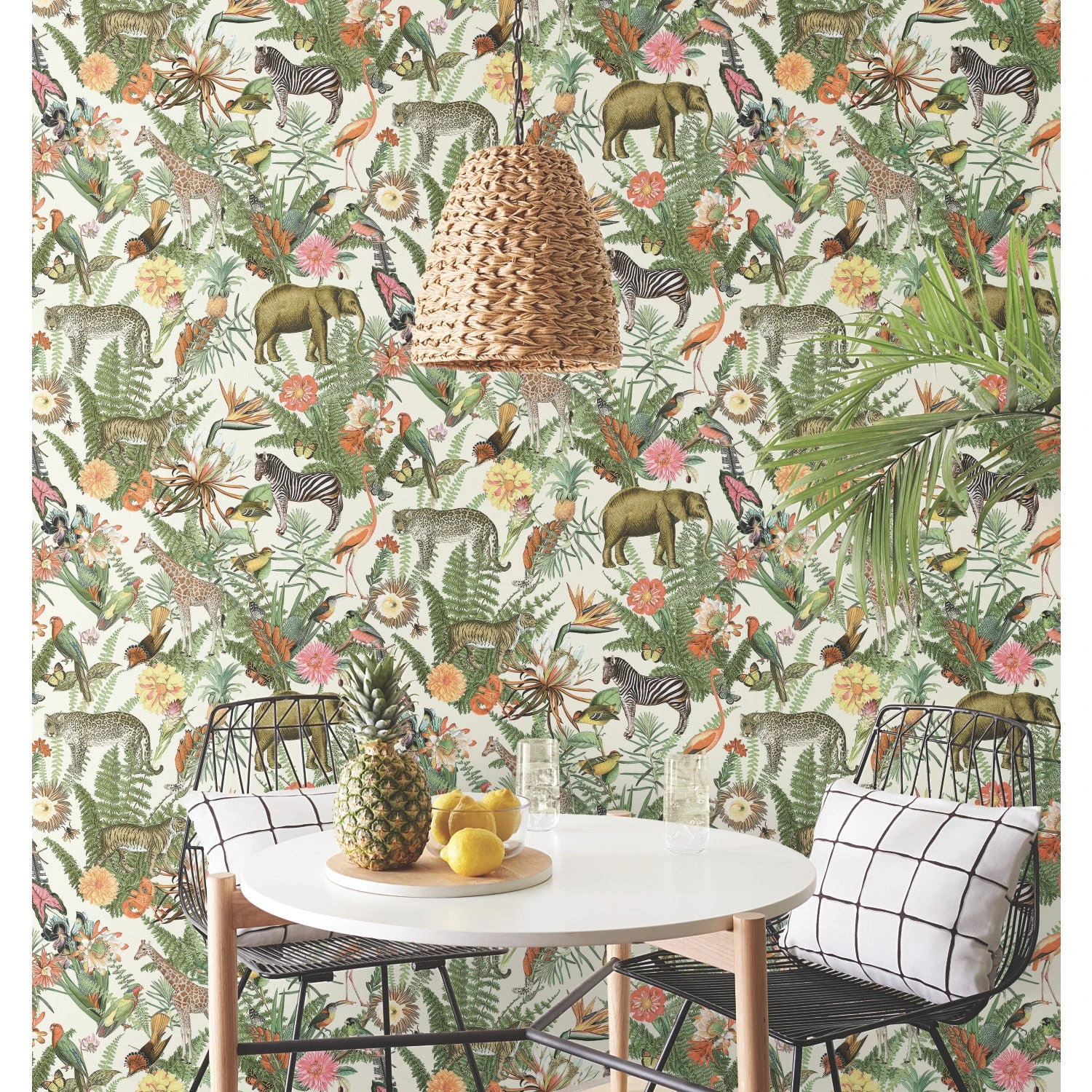 A lush oasis of tropical plants and flowers surround the exotic animals of the Serengeti in this Tropical Zoo peel and stick wallpaper from RoomMates.
