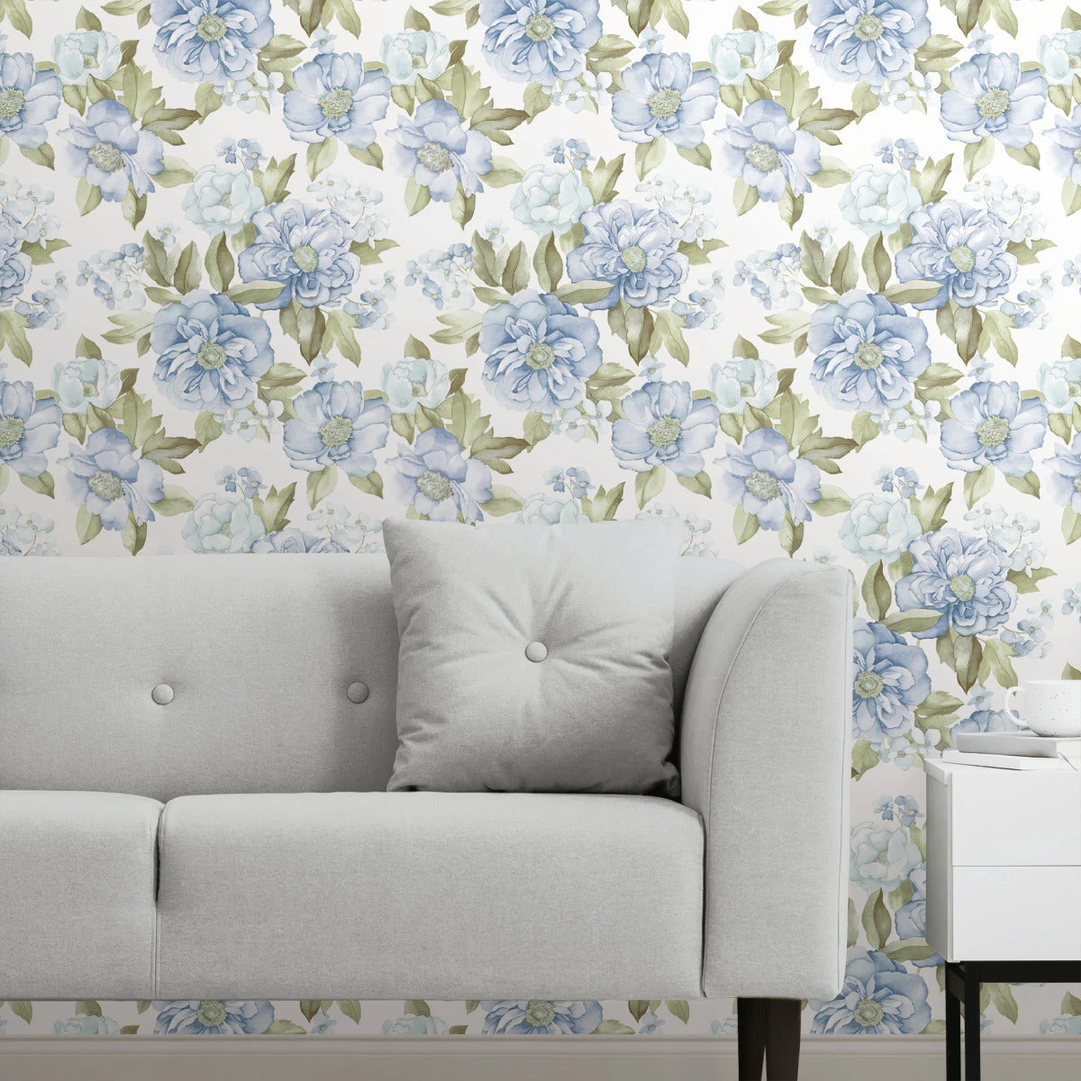 A pretty burst of blooms brings the beauty of the garden into your home with Watercolor Floral Bouquet peel and stick wallpaper from RoomMates. Peonies, roses and flowers that suggest extravagant bushes with a multitude of blossoms are rendered in watercolor effect with a lovely palette of soft mid blues and indigos with sage green leaves. This romantic design is a compliment to white and natural furniture, rattan and wicker, or to mellow contemporary furniture lines in any room in the home.