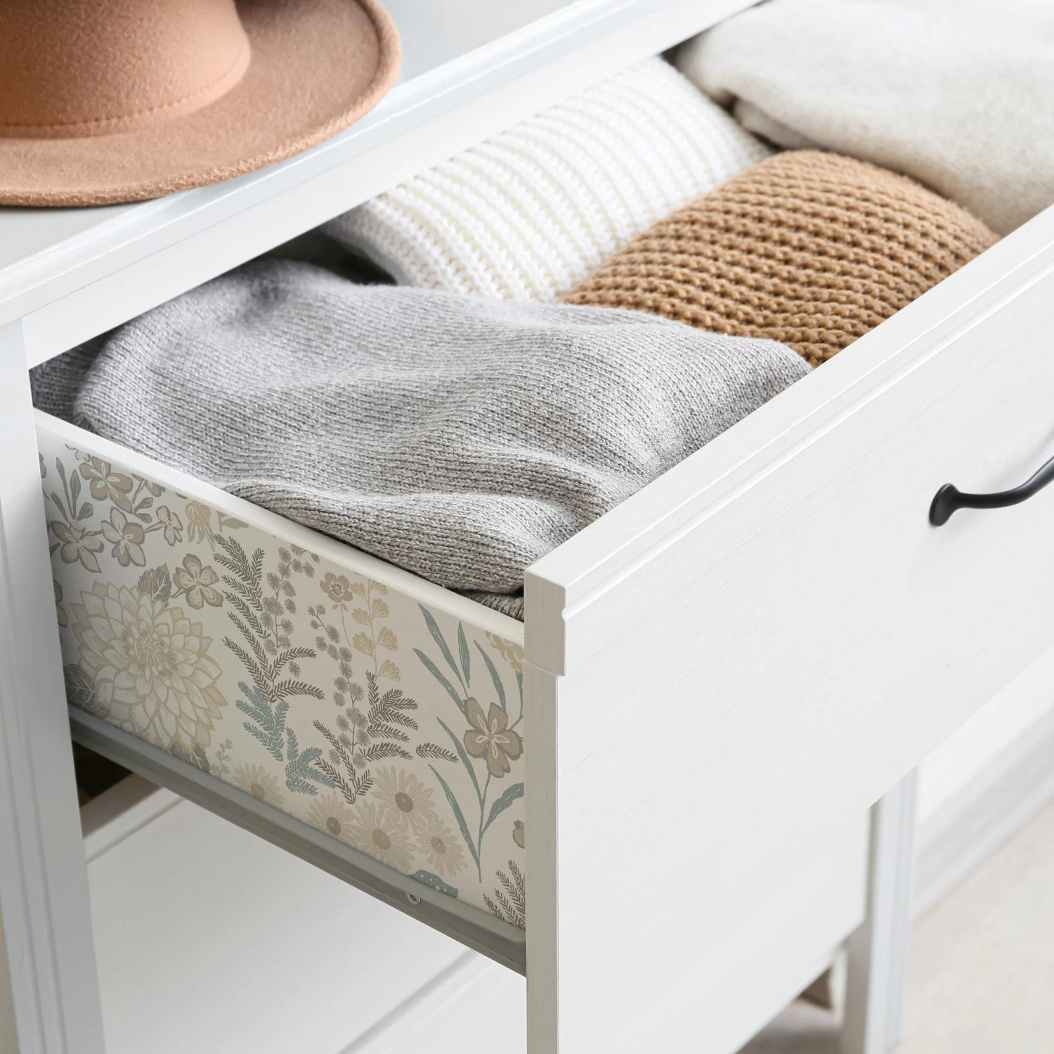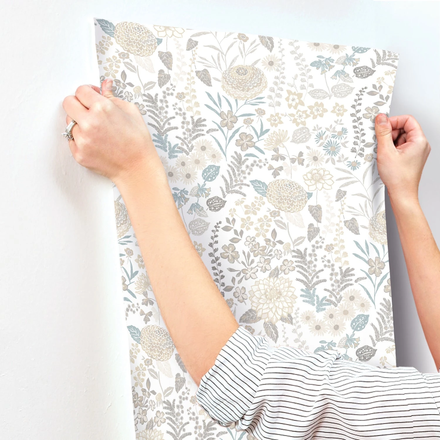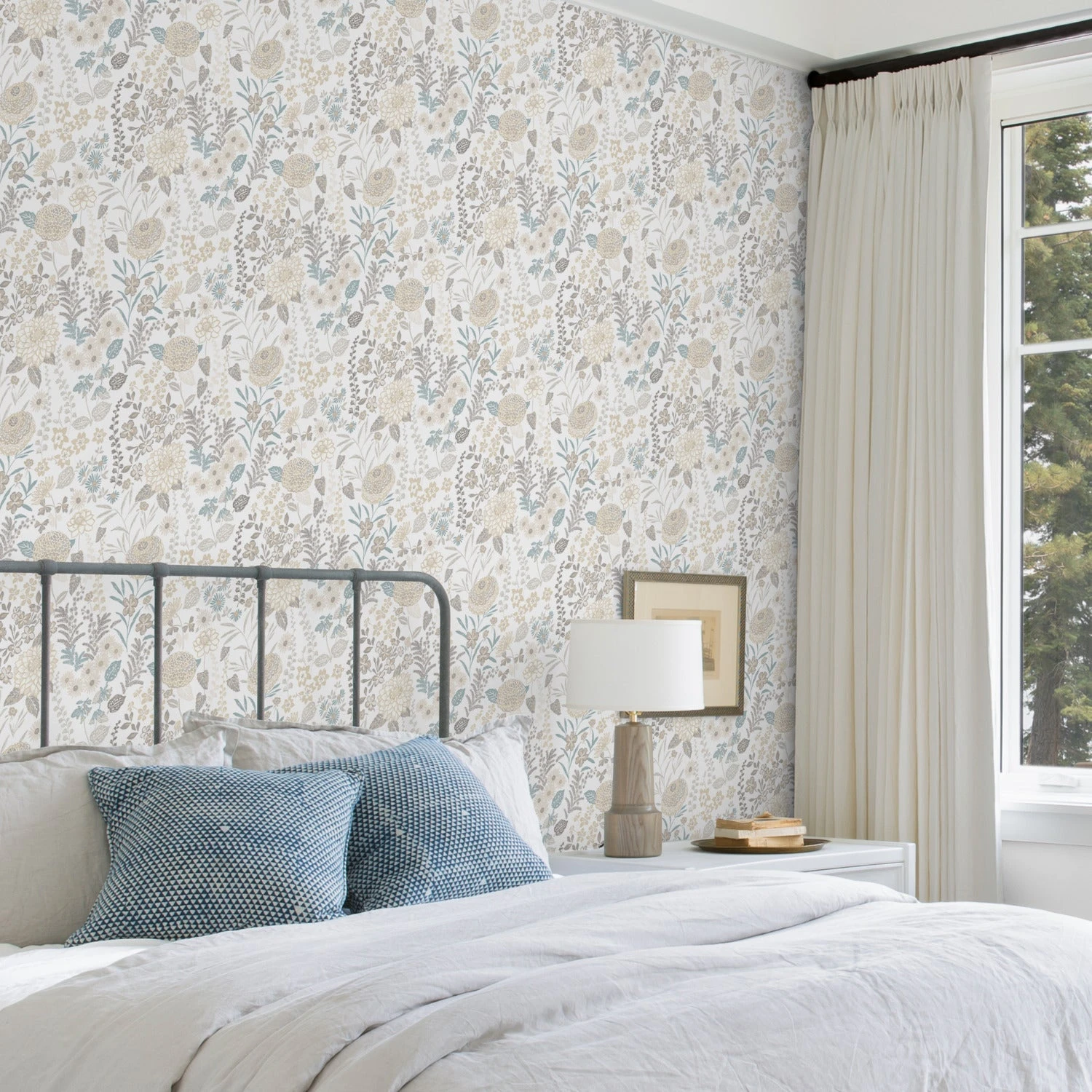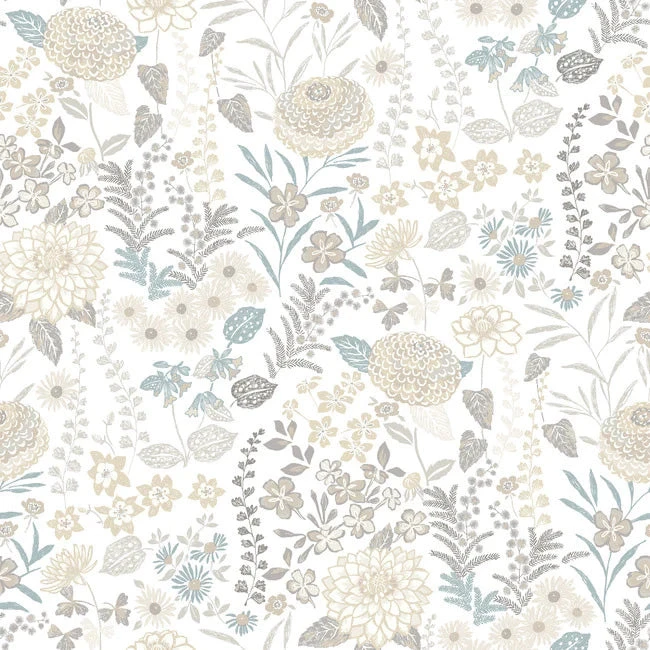 Create a whimsically wonderful space with this scandinavian-inspired peel and stick wallpaper! Neutral colors form a variety of blooms over a white background, featuring subtle pops of blue. This color scheme in combination with the design create a calming, yet playful mood for your space, perfect for a nursery, bedroom, or living space. Installing this gorgeous wallpaper is as simple as peel, stick, done!